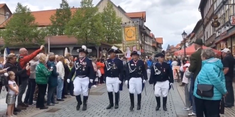 Mit einer kleinen Abordnung von 13 Personen starteten wir am Freitag, den 26 April, in Richtung Wernigerode zum 61. Deutschen Schützentag. Mit von der Partie waren u.a. unsere Landeskönigin Mady und unsere 1. Vorsitzende und Kreiskönigin Petra. Da es nur eine kleine Gruppe von Schützenschwestern und Schützenbrüdern war, die nach Wernigerode fuhr, lohnte es sich nicht, einen großen Bus zu chartern. Aus diesem Grunde reiste man in mehreren Gruppen mit dem Privatwagen an. Leider war es auch nicht möglich, dass alle Vereinsmitglieder in einem Hotel unterkamen, was schade war. Abends um 18:00 Uhr traf man sich dann zum gemeinsamen gemütlichen Abendessen – natürlich in Schützentracht, da es von da aus um 21:30 Uhr zum Zapfenstreich auf den Marktplatz ging.